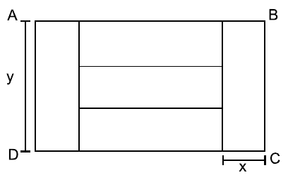 Um painel retangular ABCD, com área de 2,4 m², foi totalmente dividido em cinco regiões retangulares de mesma medida, de largura x e comprimento y, conforme mostra a figura.