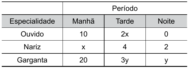 Um centro clínico especializado em nariz, ouvido e garganta atendeu, em determinado dia, 74 pacientes. A tabela apresenta algumas informações sobre o número de pacientes atendidos em cada especialidade.