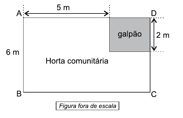 Em um espaço retangular ABCD, com 6 m de largura, foi feito um pequeno galpão retangular, e o restante do espaço foi utilizado para uma horta comunitária, conforme mostra a figura.