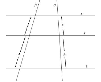 Na figura abaixo, as retas r, s e t são paralelas. E as retas p e q são transversais.