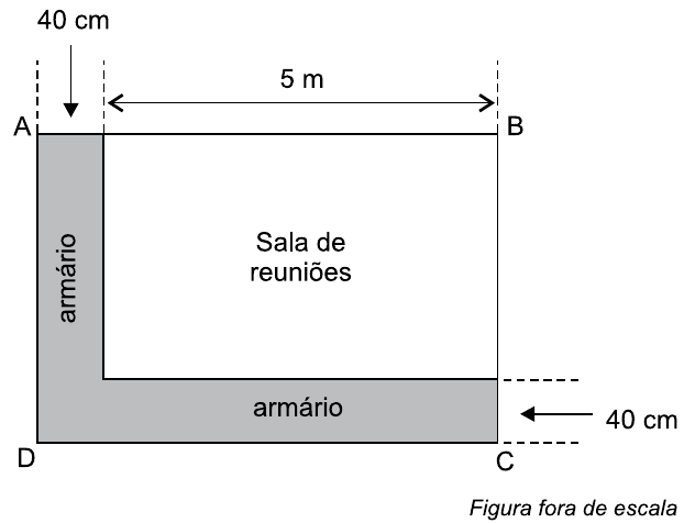 Em uma sala retangular ABCD, com 18,8 m de perímetro, foram colocados armários com 40 cm de profundidade, que ocuparam totalmente o comprimento de duas paredes consecutivas, conforme mostra a figura.