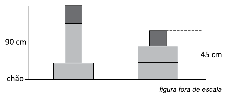 Duas caixas cúbicas idênticas e quatro caixas com forma de paralelepípedos reto-retângulos, também idênticas, foram empilhadas, como mostra a figura. Os paralelepípedos têm duas faces idênticas às faces dos cubos.