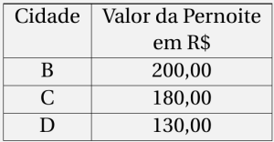 Utilizando a tabela de preços, a quantia gasta com pernoites por Alberto e Breno para cumprir a agenda da semana foi de