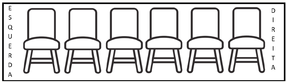 Para a realização de determinada brincadeira, um professor deseja organizar quatro alunos (Adriano, Bernardo, Celso e Daniel) em uma fila de seis cadeiras, conforme o esquema a seguir: