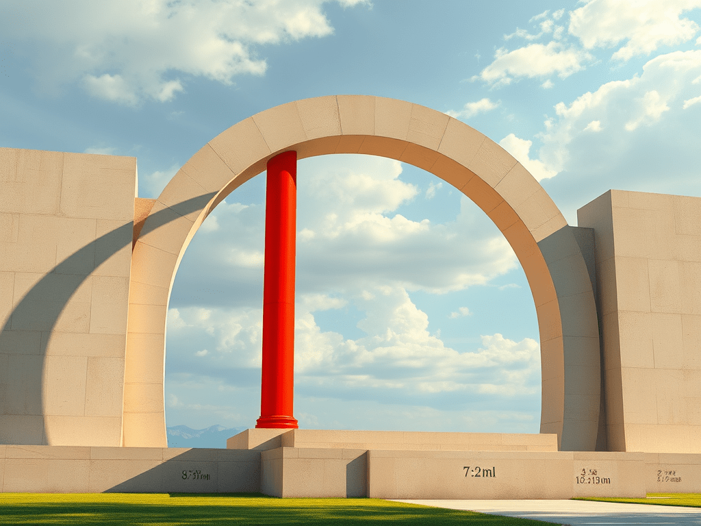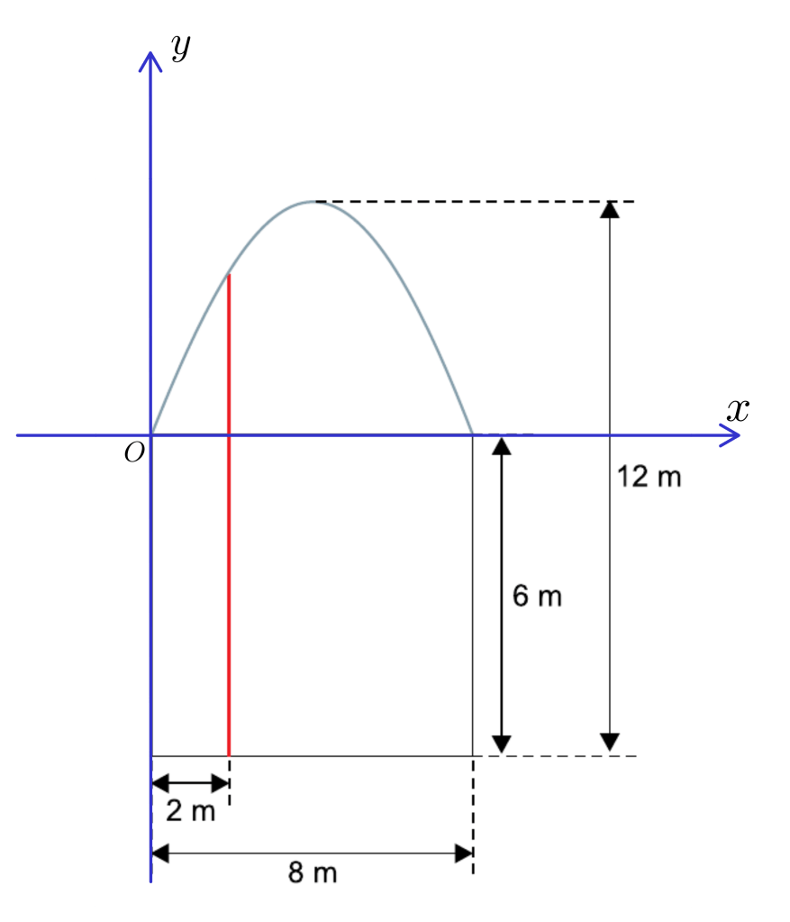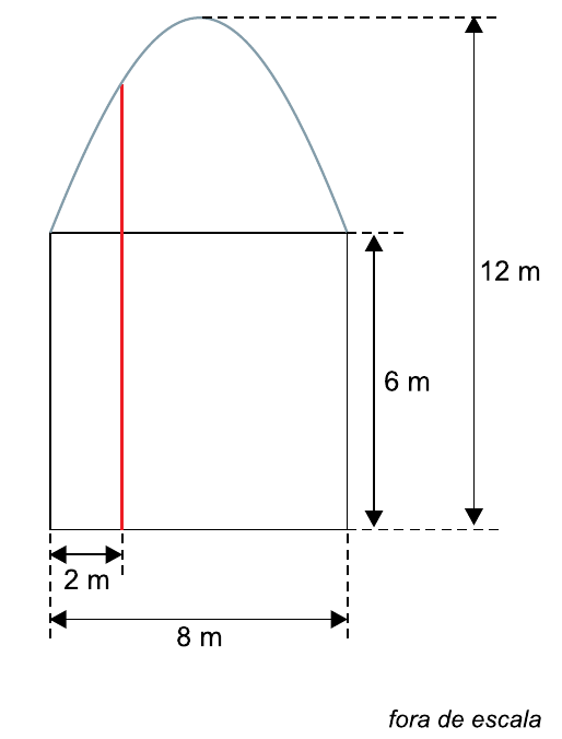 O ponto mais alto do portal dista 12 m da base. Deseja-se adicionar uma coluna vertical, destacada em vermelho na figura, cuja base dista 2 m de uma das laterais da estrutura retangular. A altura da coluna será de