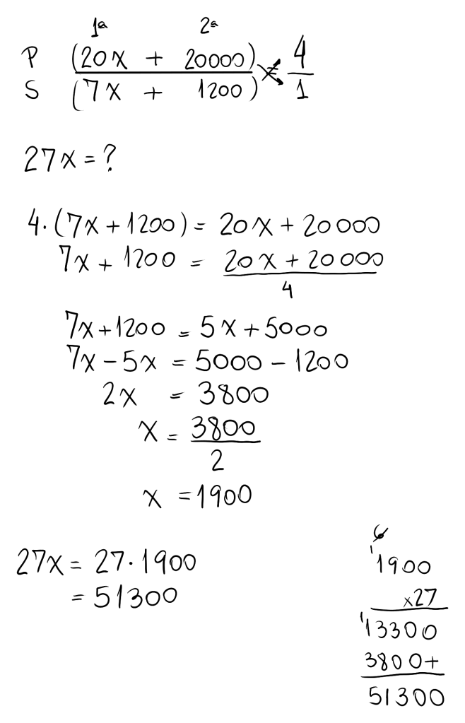 A saída de veículos de uma cidade para o litoral pode ser realizada por duas estradas: pela estrada principal ou pela estrada secundária. Em um feriado, a saída de veículos foi realizada de maneira que, na primeira metade do dia, para cada 20 veículos que saíram da cidade pela estrada principal, 7 saíram pela secundária e, na outra metade do dia, 20 000 veículos saíram da cidade pela estrada principal e 1 200 pela secundária. Nesse feriado, a razão entre o número de veículos que saíram da cidade pela estrada principal e o número de veículos que saíram pela estrada secundária foi igual a 4, portanto, na primeira metade do dia, o total de veículos que saíram dessa cidade para o litoral corresponde a