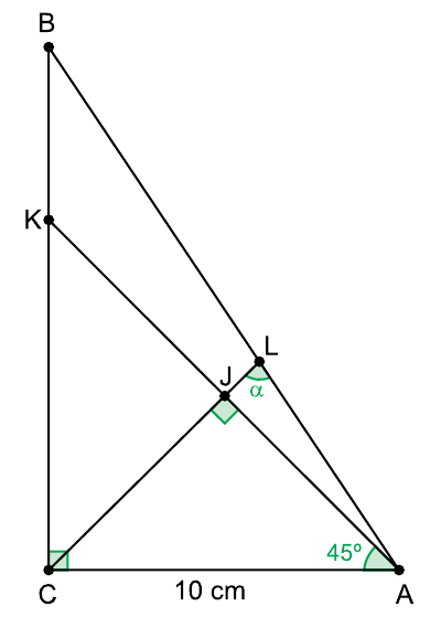 Em um plano, os pontos K e L estão sobre os lados do triângulo retângulo ABC e o ponto J é a intersecção dos segmentos perpendiculares e