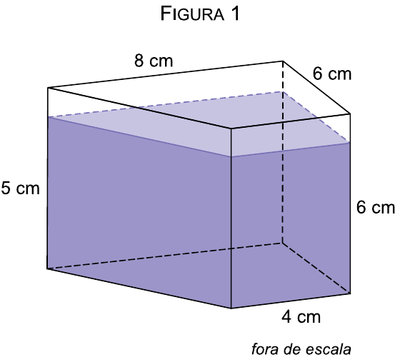 Um prisma reto tem 6 cm de altura, está parcialmente preenchido com água e sua base é um trapézio retângulo. Esse trapézio tem 6 cm de altura, sua base maior mede 8 cm e sua base menor mede 4 cm. Se esse prisma for apoiado sobre sua base trapezoidal, a água em seu interior atinge uma altura de 5 cm, conforme a figura 1.