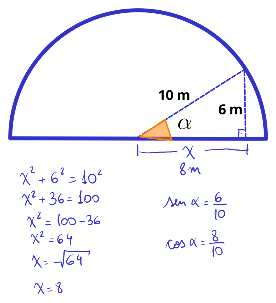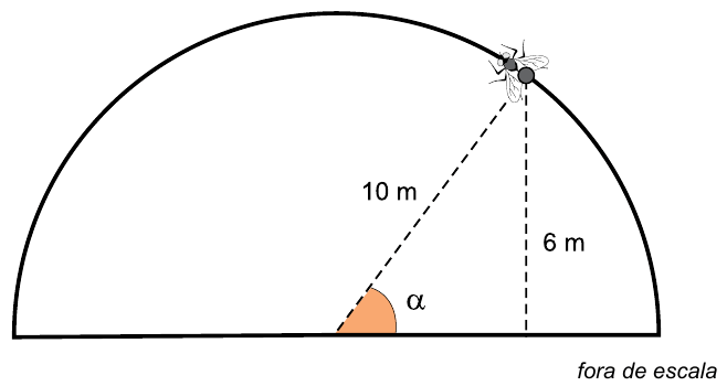 A figura mostra o perfil longitudinal de uma cúpula semiesférica, de raio 10 m, e um inseto que está se deslocando sobre a cúpula. Quando o inseto se encontra a 6 m de altura em relação à horizontal, o segmento de reta que liga o inseto ao centro da cúpula faz com a horizontal um ângulo de medida α, conforme a figura.