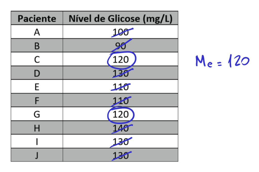 Dessa maneira, a média, a mediana e a moda dos níveis de glicose dos pacientes, nessa ordem, são