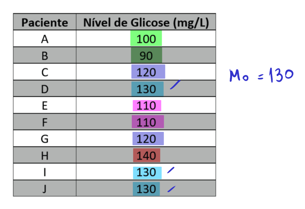 Com base nos dados apresentados no quadro, o médico responsável deseja calcular a média, a mediana e a moda dos níveis de glicose para compreender melhor a eficácia do tratamento.
