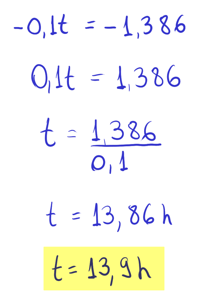 Sabe-se que a constante de eliminação k do medicamento é 0, 1h −1 . O médico administrou uma dose inicial que resultou em uma concentração inicial de 100 mg/L. Para garantir que o medicamento permaneça eficaz, o médico precisa calcular quanto tempo levará para que a concentração do medicamento no sangue do paciente caia para 25 mg/L.