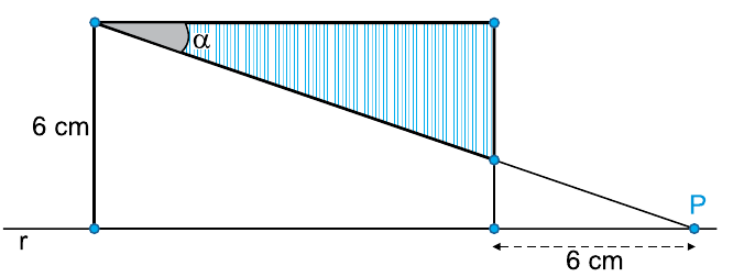 No plano, um lado de um retângulo está sobre a reta r. Um ponto P, sobre a reta r, é tal que o segmento de reta que liga P a um dos vértices do retângulo forma, com um de seus lados, um ângulo α, conforme mostra a figura.
