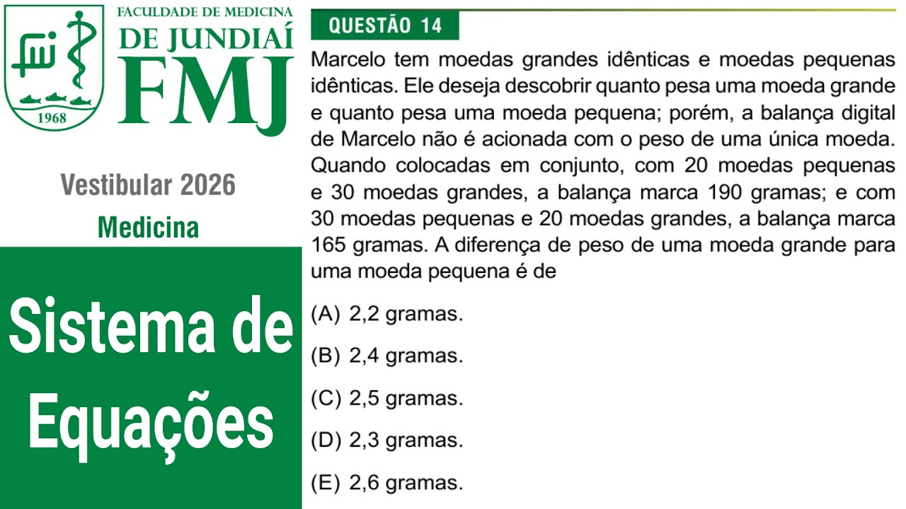 Para resolver essa questão, o objetivo é encontrar a diferença de peso entre uma moeda grande e uma moeda pequena. A estratégia será montar um sistema de equações lineares a partir das informações de pesagem fornecidas.