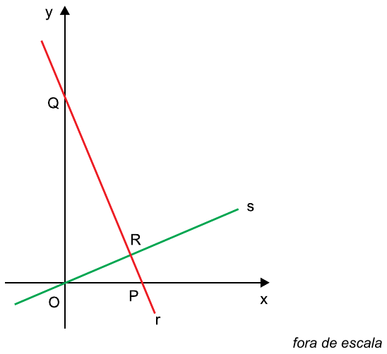 No plano cartesiano de origem O, a reta r, de equação , corta o eixo x no ponto P e o eixo y no ponto Q. A reta s passa pela origem e encontra a reta r no ponto R, conforme mostra a figura.