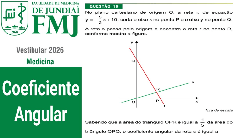 Assista ao vídeo acima para ver a aplicação da relação de áreas, os cálculos para encontrar as coordenadas do ponto R e a determinação final do coeficiente angular.