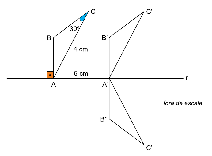 QUESTÃO 18 O triângulo ABC é isósceles com AB = BC e AC = 4 cm. Seu vértice A pertence à reta r de modo que AB e r são perpendiculares. O triângulo A′B′C′ foi obtido a partir do triângulo ABC por uma translação de 5 cm à direita ao longo da reta r , e o triângulo A′B′′C′′ foi obtido a partir do triângulo A′B′C′ por reflexão em relação à reta r , conforme mostra a figura.
