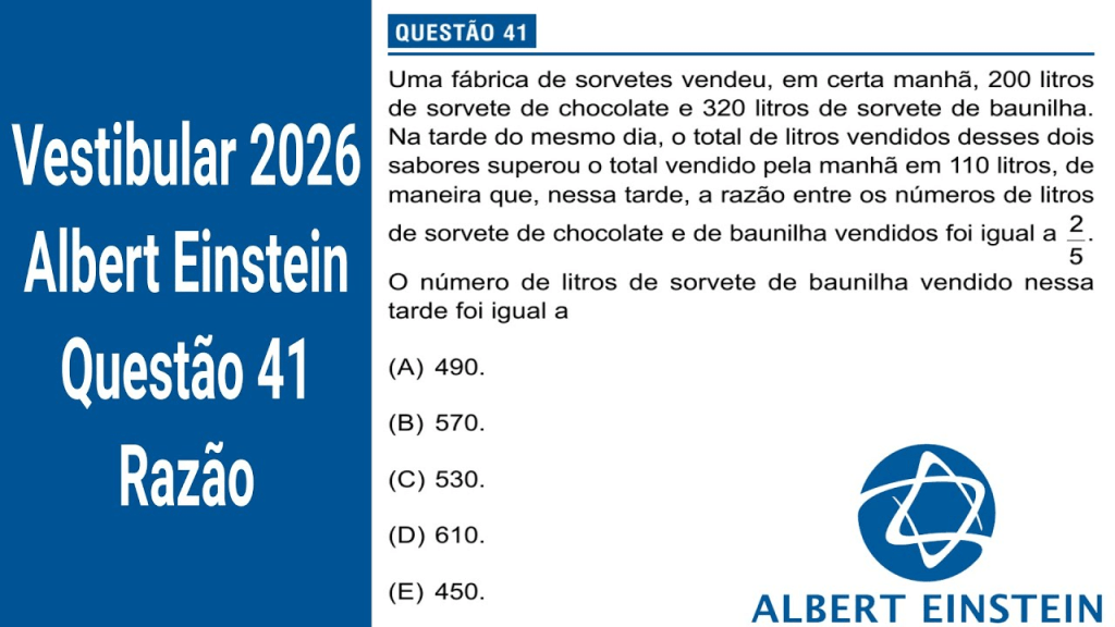 Uma fábrica de sorvetes vendeu, em certa manhã, 200 litros de sorvete de chocolate e 320 litros de sorvete de baunilha. Na tarde do mesmo dia, o total de litros vendidos desses dois sabores superou o total vendido pela manhã em 110 litros, de maneira que, nessa tarde, a razão entre os números de litros de sorvete de chocolate e de baunilha vendidos foi igual a 2/5.