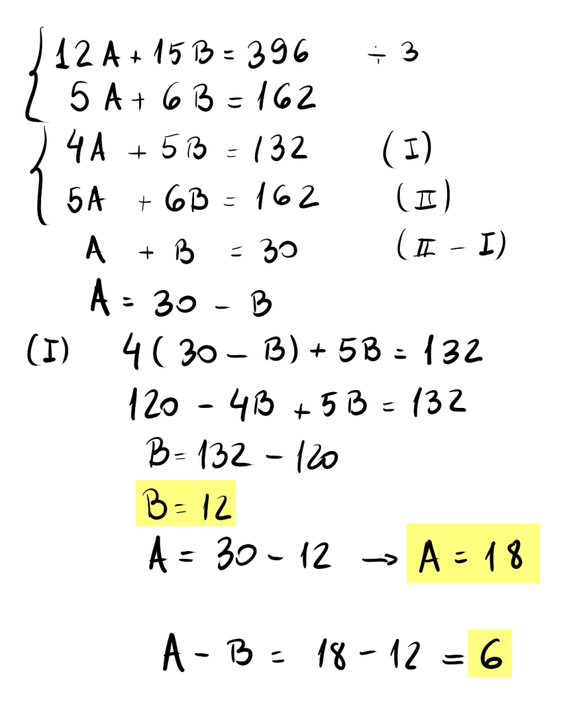 Para ir de casa ao trabalho, Paulo tem apenas duas opções de condução: o ônibus A, que percorre 12 km e cuja passagem custa R$ 5,00, ou o ônibus B, que percorre 15 km e cuja passagem custa R$ 6,00. Em um período de N dias, Paulo gastou R$ 162,00 para ir de casa ao trabalho, tendo percorrido 396 km. Nesse período, o número de vezes em que Paulo foi ao trabalho com o ônibus A excede o número de vezes em que ele foi com o ônibus B em