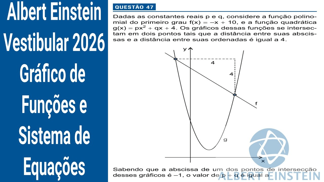 O objetivo desta questão é encontrar o valor da soma p + q. A estratégia será usar as informações sobre os pontos de intersecção dos gráficos para criar um sistema de equações e, com ele, descobrir os valores das constantes p e q.