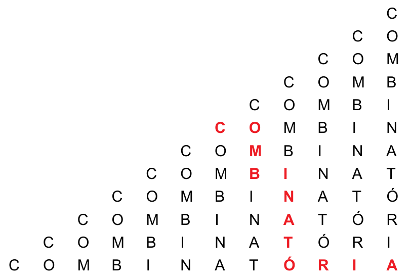 Considere a montagem a seguir, que forma a palavra COMBINATÓRIA ao se fazer um caminho que inicia em uma das letras C e segue, sempre, para a direita ou para baixo.