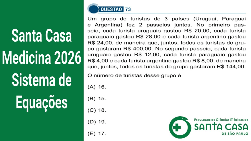 Um grupo de turistas de 3 países (Uruguai, Paraguai e Argentina) fez 2 passeios juntos. No primeiro passeio, cada turista uruguaio gastou R$ 20,00, cada turista paraguaio gastou R$ 28,00 e cada turista argentino gastou R$ 24,00, de maneira que, juntos, todos os turistas do grupo gastaram R$ 400,00. No segundo passeio, cada turista uruguaio gastou R$ 12,00, cada turista paraguaio gastou R$ 4,00 e cada turista argentino gastou R$ 8,00, de maneira que, juntos, todos os turistas do grupo gastaram R$ 144,00. O número de turistas desse grupo é