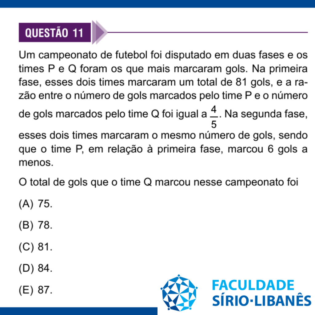 Um campeonato de futebol foi disputado em duas fases e os times P e Q foram os que mais marcaram gols. Na primeira fase, esses dois times marcaram um total de 81 gols, e a razão entre o número de gols marcados pelo time P e o número de gols marcados pelo time Q foi igual a 4/5. Na segunda fase, esses dois times marcaram o mesmo número de gols, sendo que o time P, em relação à primeira fase, marcou 6 gols a menos. O total de gols que o time Q marcou nesse campeonato foi