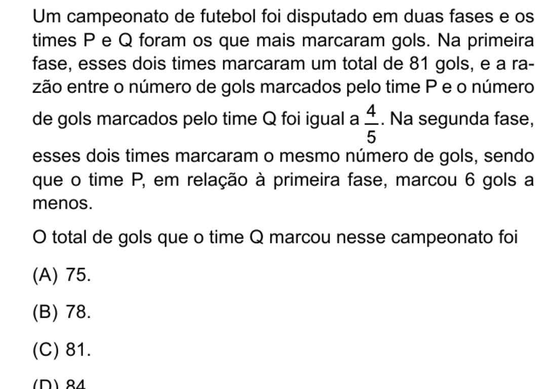 Um campeonato de futebol foi disputado em duas fases e os times P e Q foram os que mais marcaram gols. Na primeira fase, esses dois times marcaram um total de 81 gols, e a razão entre o número de gols marcados pelo time P e o número de gols marcados pelo time Q foi igual a 4/5. Na segunda fase, esses dois times marcaram o mesmo número de gols, sendo que o time P, em relação à primeira fase, marcou 6 gols a menos. O total de gols que o time Q marcou nesse campeonato foi