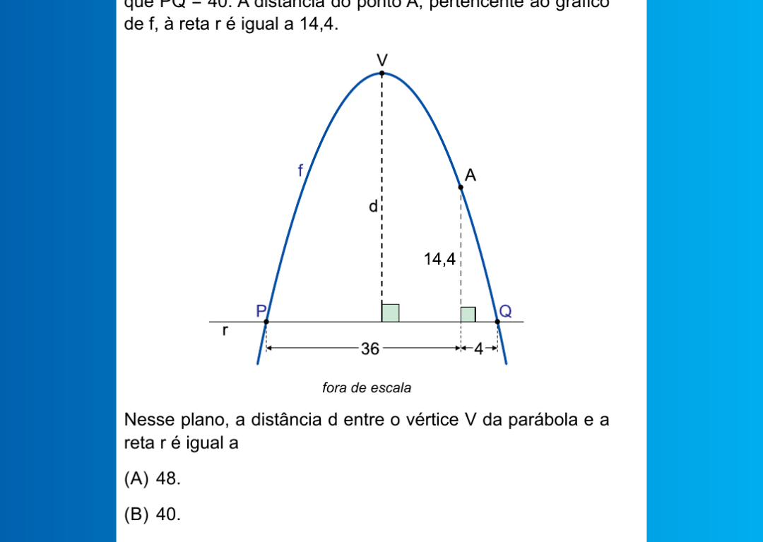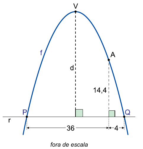 No plano cartesiano, o gráfico que representa a função quadrática f intersecta a reta horizontal r nos pontos P e Q, tal que PQ = 40. A distância do ponto A, pertencente ao gráfico de f, à reta r é igual a 14,4.
