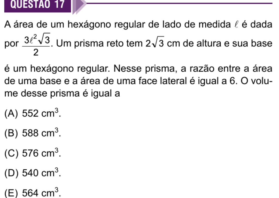 cm de altura e sua base é um hexágono regular. Nesse prisma, a razão entre a área de uma base e a área de uma face lateral é igual a 6. O volume desse prisma é igual a