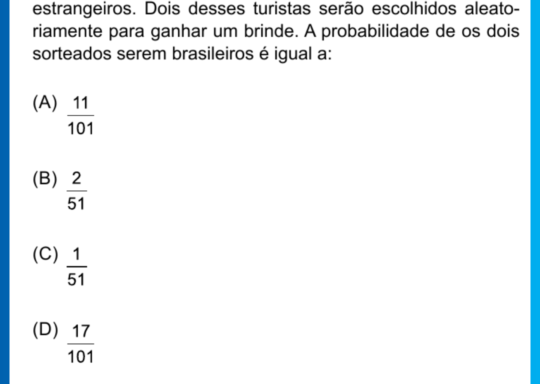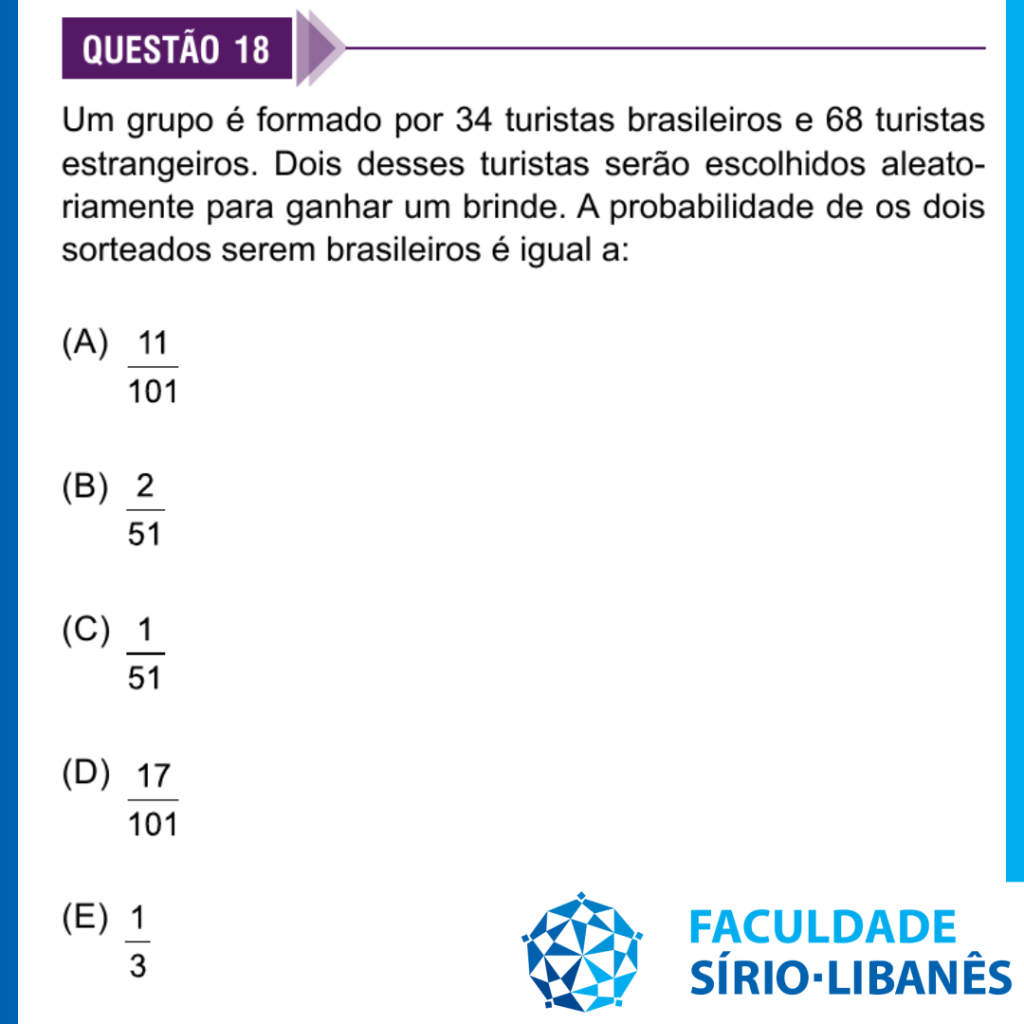 Um grupo é formado por 34 turistas brasileiros e 68 turistas estrangeiros. Dois desses turistas serão escolhidos aleatoriamente para ganhar um brinde. A probabilidade de os dois sorteados serem brasileiros é igual a: