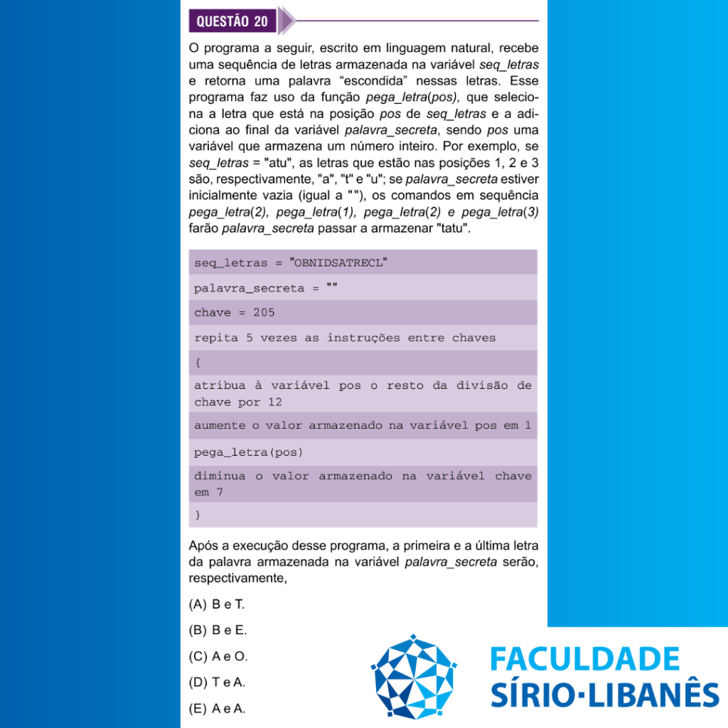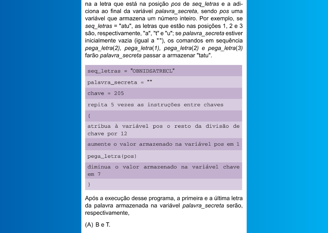 O programa a seguir, escrito em linguagem natural, recebe uma sequência de letras armazenada na variável seq_letras e retorna uma palavra “escondida” nessas letras. Esse programa faz uso da função pega_letra(pos), que seleciona a letra que está na posição pos de seq_letras e a adiciona ao final da variável palavra_secreta, sendo pos uma variável que armazena um número inteiro. Por exemplo, se seq_letras = “atu”, as letras que estão nas posições 1, 2 e 3 são, respectivamente, “a”, “t” e “u”; se palavra_secreta estiver inicialmente vazia (igual a ” “), os comandos em sequência pega_letra(2), pega_letra(1), pega_letra(2) e pega_letra(3) farão palavra_secreta passar a armazenar “tatu”.