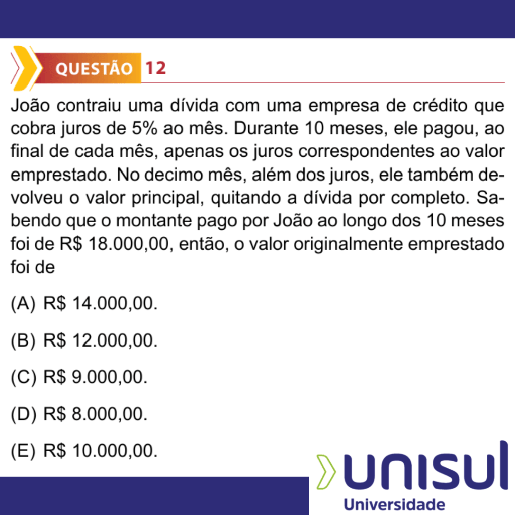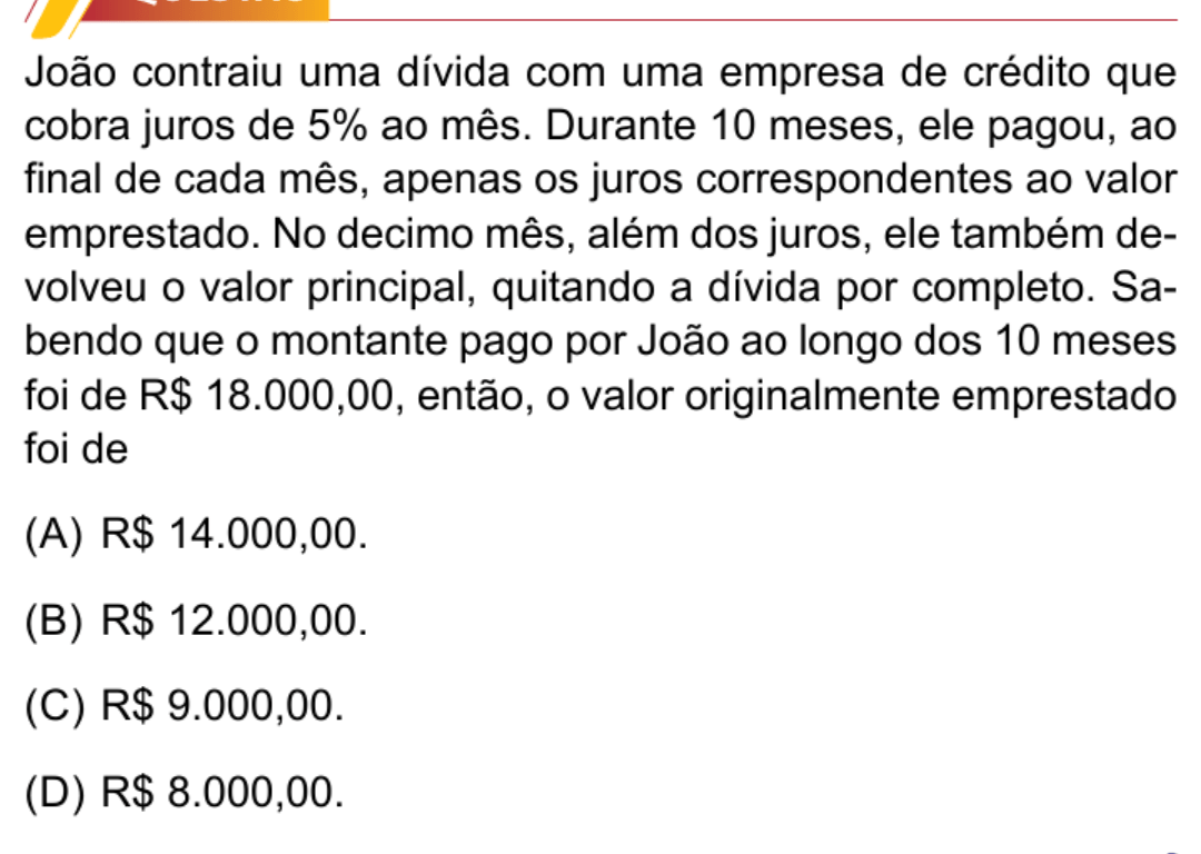 João contraiu uma dívida com uma empresa de crédito que cobra juros de 5% ao mês. Durante 10 meses, ele pagou, ao final de cada mês, apenas os juros correspondentes ao valor emprestado. No decimo mês, além dos juros, ele também devolveu o valor principal, quitando a dívida por completo. Sabendo que o montante pago por João ao longo dos 10 meses foi de R$ 18.000,00, então, o valor originalmente emprestado foi de