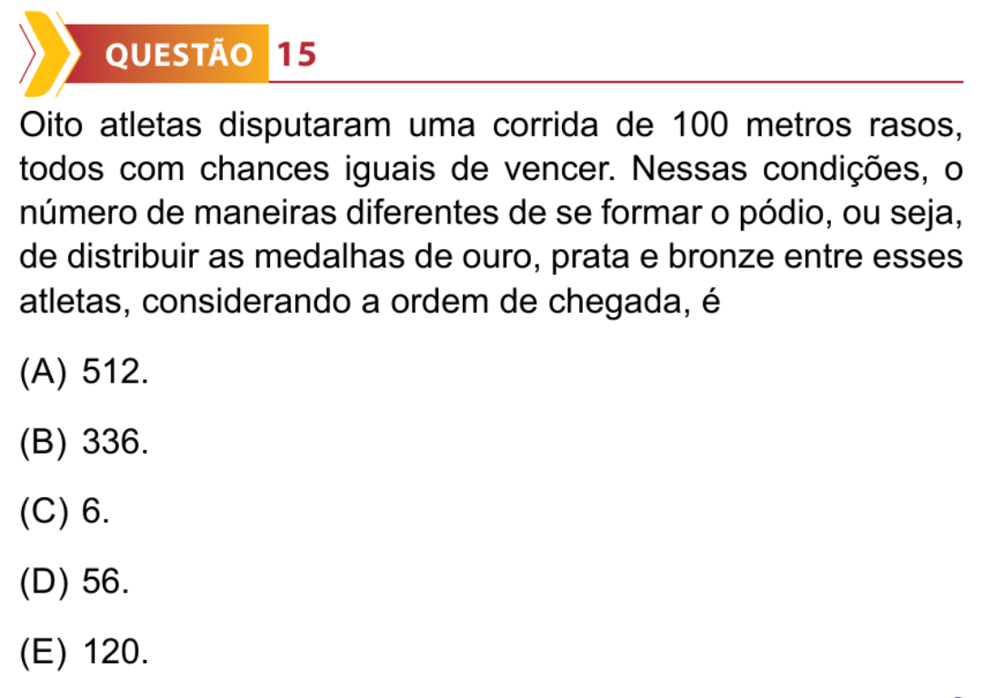 Oito atletas disputaram uma corrida de 100 metros rasos, todos com chances iguais de vencer. Nessas condições, o número de maneiras diferentes de se formar o pódio, ou seja, de distribuir as medalhas de ouro, prata e bronze entre esses atletas, considerando a ordem de chegada, é