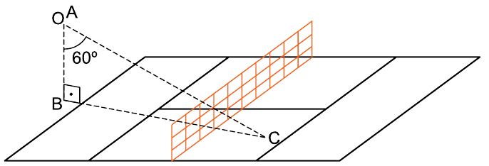 No momento do saque, um jogador de tênis atinge a bola na posição A, a uma altura de 3 m do chão (distância AB). A bola passa por cima da rede e toca o solo na posição C, conforme mostra a figura.