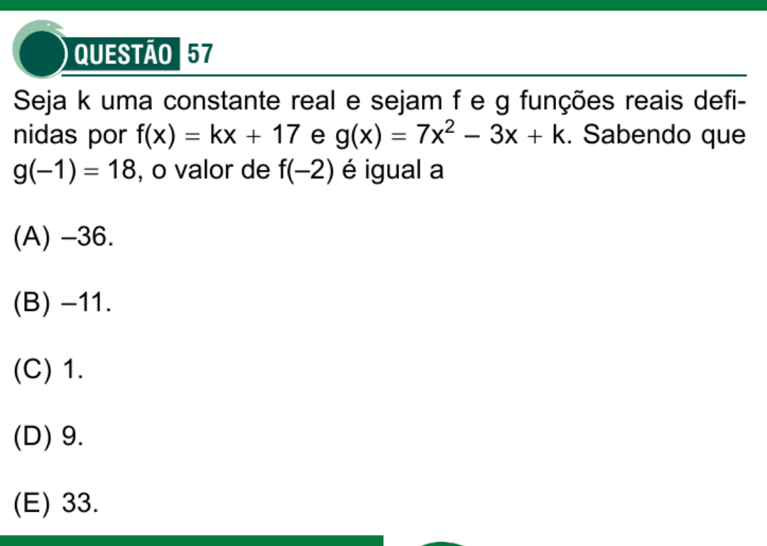 Seja k uma constante real e sejam f e g funções reais definidas por f(x) = kx + 17 e g(x) = 7x² – 3x + k. Sabendo que g(–1) = 18, o valor de f(–2) é igual a