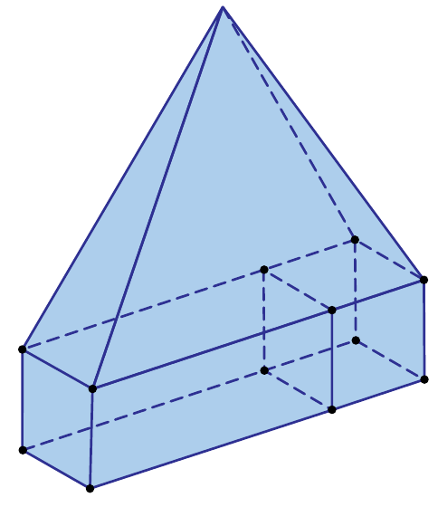 Uma montagem foi feita com um cubo de 27 cm³ de volume, um prisma reto (que não é um cubo) e uma pirâmide reta, de maneira que o cubo e o prisma têm uma face em comum e a base da pirâmide tem dois vértices em comum com o prisma e dois vértices em comum com o cubo, como mostra a figura.