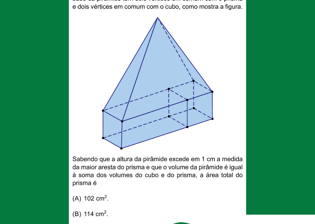 Sabendo que a altura da pirâmide excede em 1 cm a medida da maior aresta do prisma e que o volume da pirâmide é igual à soma dos volumes do cubo e do prisma, a área total do prisma é