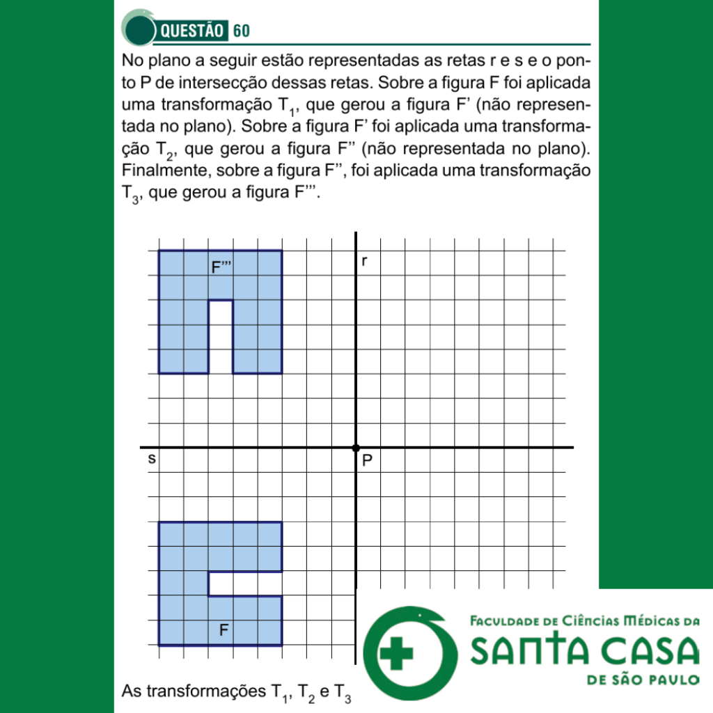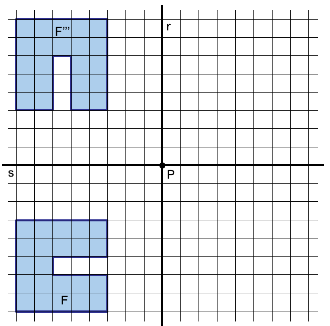 No plano a seguir estão representadas as retas r e s e o ponto P de intersecção dessas retas. Sobre a figura F foi aplicada uma transformação T1, que gerou a figura F’ (não representada no plano). Sobre a figura F’ foi aplicada uma transformação T2, que gerou a figura F’’ (não representada no plano). Finalmente, sobre a figura F’’, foi aplicada uma transformação T3, que gerou a figura F’’’.
