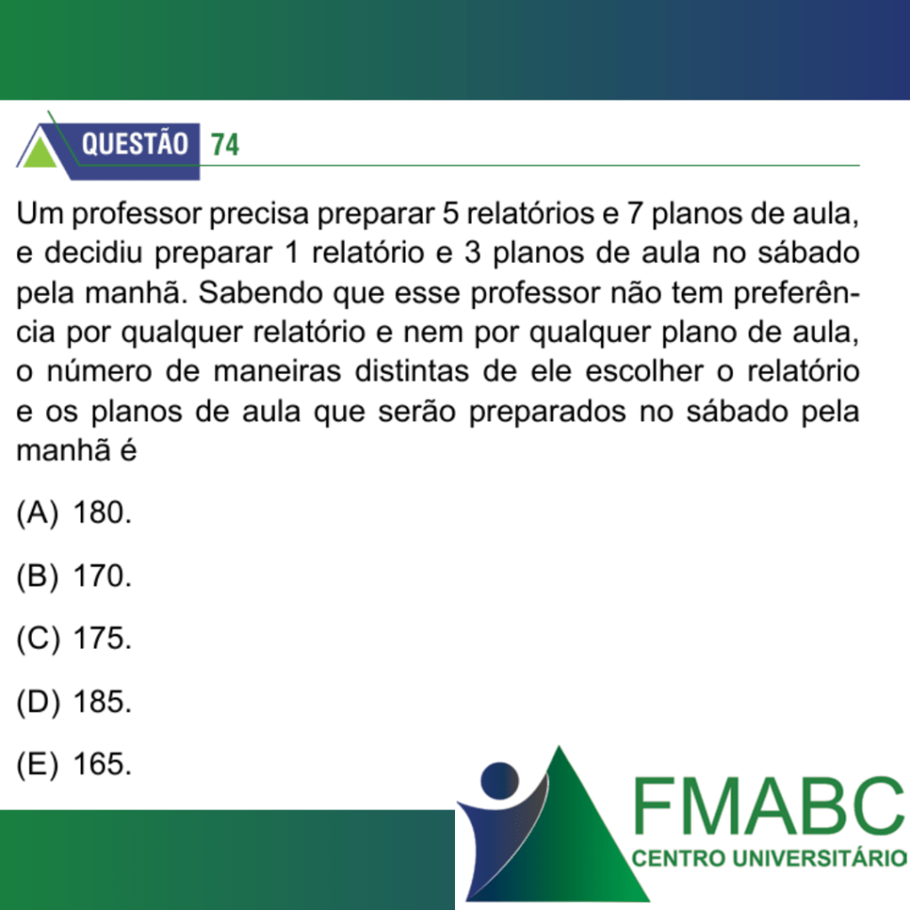 Um professor precisa preparar 5 relatórios e 7 planos de aula, e decidiu preparar 1 relatório e 3 planos de aula no sábado pela manhã. Sabendo que esse professor não tem preferência por qualquer relatório e nem por qualquer plano de aula, o número de maneiras distintas de ele escolher o relatório e os planos de aula que serão preparados no sábado pela manhã é
