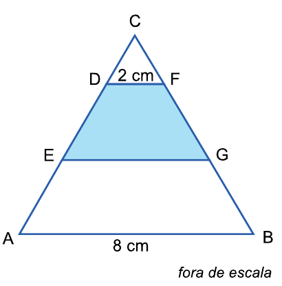 Considere o triângulo equilátero ABC, de lados medindo 8 cm. Sobre o lado AC foram marcados os pontos D e E, e sobre o lado BC foram marcados os pontos F e G, de modo que os segmentos DF e EG são paralelos ao lado AB, com DF = 2 cm, conforme mostra a figura.