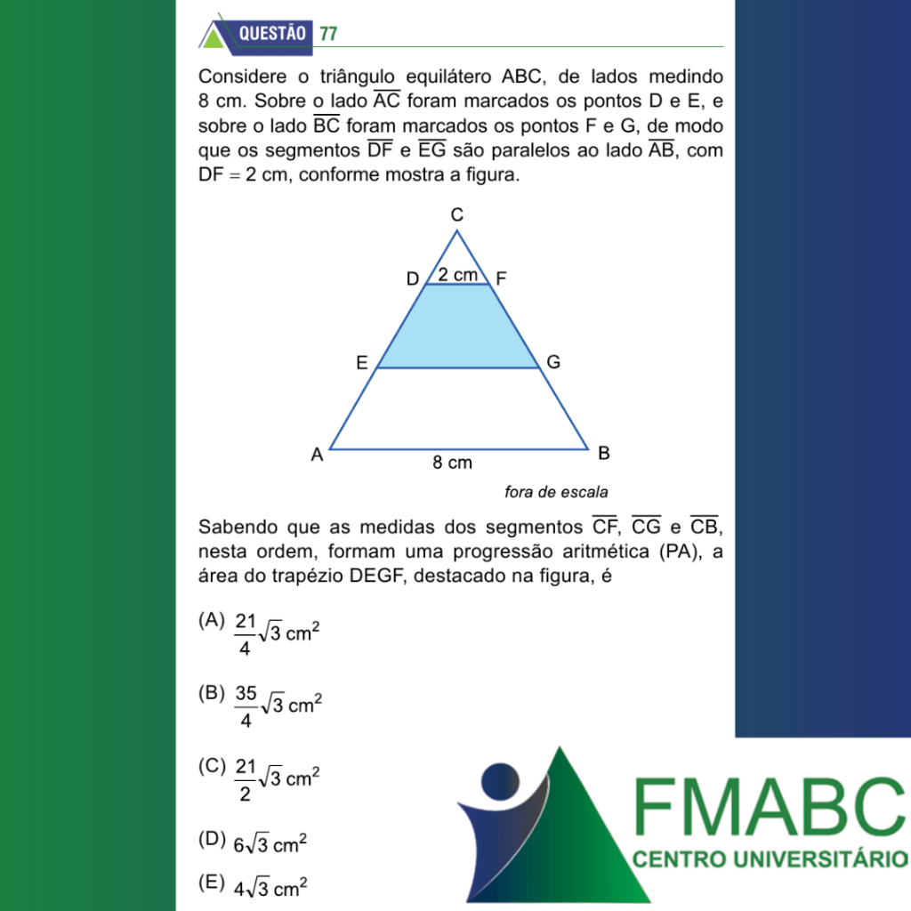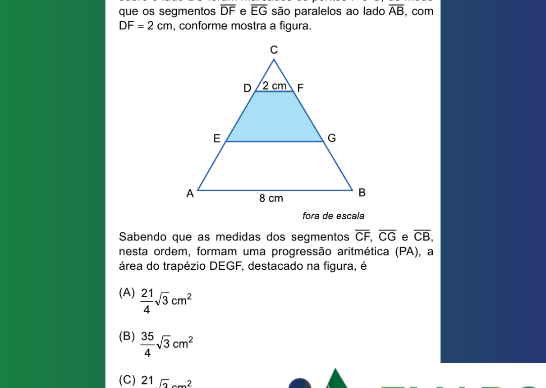 Sabendo que as medidas dos segmentos CF, CG e CB, nesta ordem, formam uma progressão aritmética (PA), a área do trapézio DEGF, destacado na figura, é