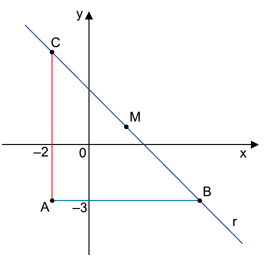 Em um plano cartesiano, o triângulo retângulo ABC, reto em A, com A (– 2, – 3), tem os vértices B e C sobre a reta r de equação y = – x + 3, e o lado AB paralelo ao eixo do x, conforme mostra a figura.