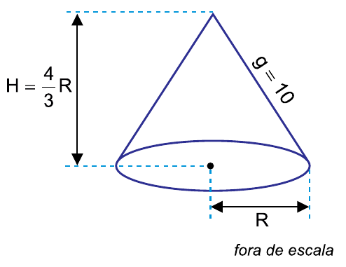 Um cone reto tem raio de base R, altura H = 4/3 R e geratriz (g) medindo 10 cm, conforme mostra a figura, em que todas as medidas indicadas estão em cm.