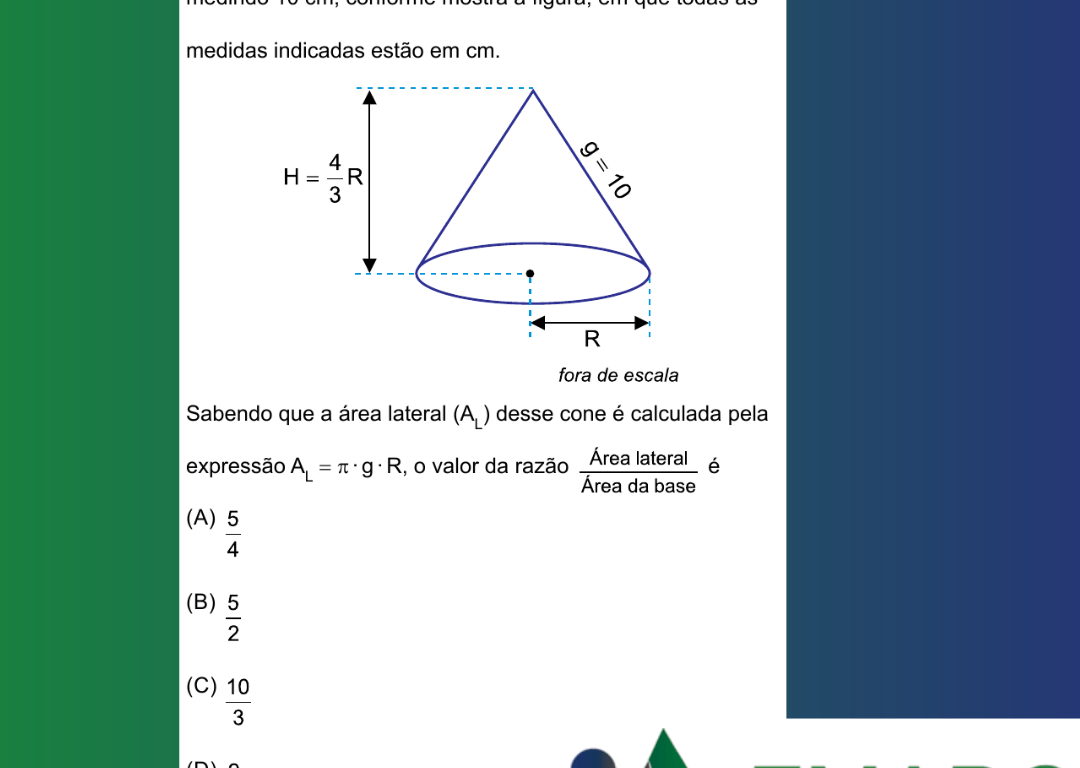 Sabendo que a área lateral (AL) desse cone é calculada pela expressão AL = π · g · R, o valor da razão (Área Lateral)/(Área da Base) é
