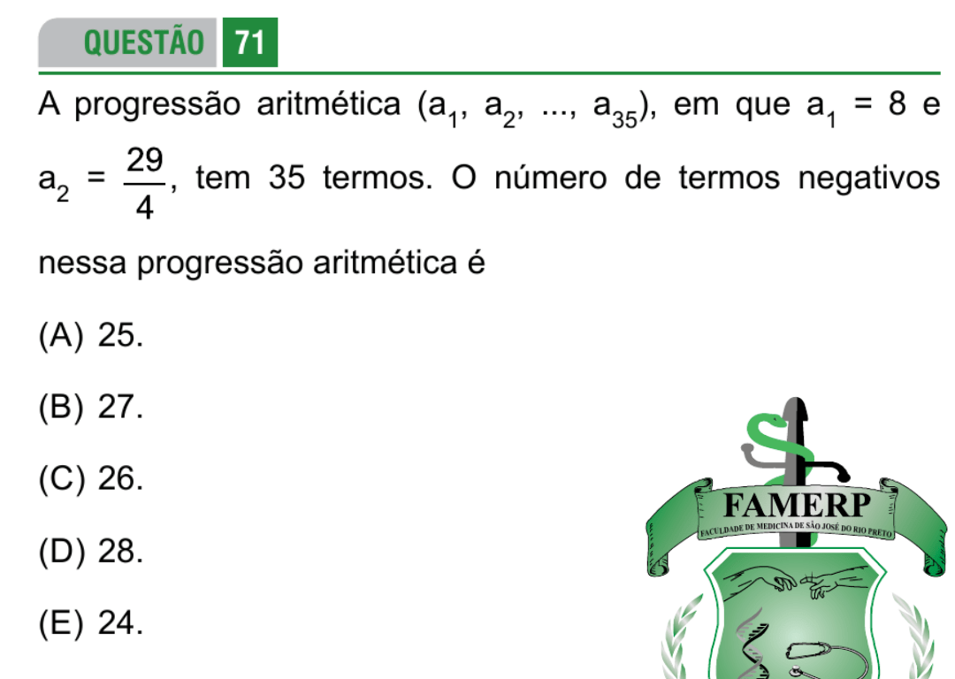 A progressão aritmética (a1, a2, …, a35), em que a1 = 8 e a2 = 29/4, tem 35 termos. O número de termos negativos nessa progressão aritmética é