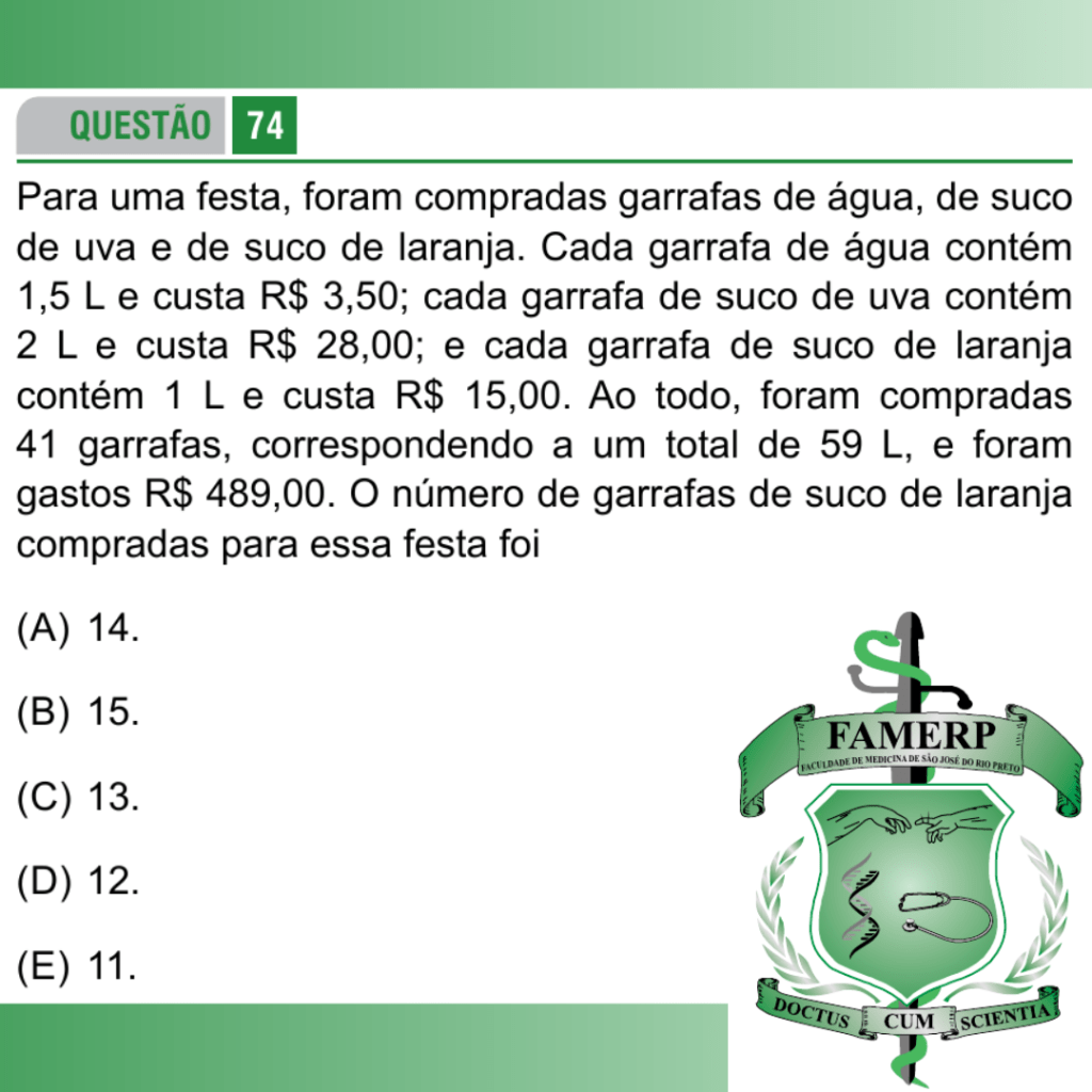 Para uma festa, foram compradas garrafas de água, de suco de uva e de suco de laranja. Cada garrafa de água contém 1,5 L e custa R$ 3,50; cada garrafa de suco de uva contém 2 L e custa R$ 28,00; e cada garrafa de suco de laranja contém 1 L e custa R$ 15,00. Ao todo, foram compradas 41 garrafas, correspondendo a um total de 59 L, e foram gastos R$ 489,00. O número de garrafas de suco de laranja compradas para essa festa foi