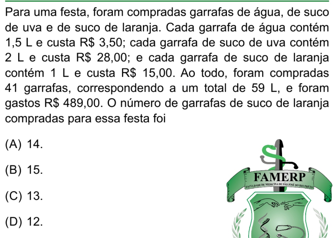 Para uma festa, foram compradas garrafas de água, de suco de uva e de suco de laranja. Cada garrafa de água contém 1,5 L e custa R$ 3,50; cada garrafa de suco de uva contém 2 L e custa R$ 28,00; e cada garrafa de suco de laranja contém 1 L e custa R$ 15,00. Ao todo, foram compradas 41 garrafas, correspondendo a um total de 59 L, e foram gastos R$ 489,00. O número de garrafas de suco de laranja compradas para essa festa foi
