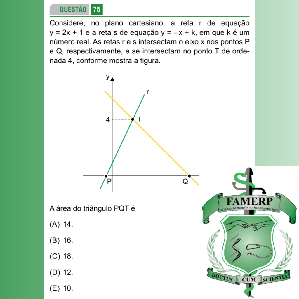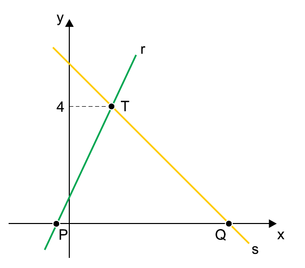 Considere, no plano cartesiano, a reta r de equação y = 2x + 1 e a reta s de equação y = – x + k, em que k é um número real. As retas r e s intersectam o eixo x nos pontos P e Q, respectivamente, e se intersectam no ponto T de ordenada 4, conforme mostra a figura.