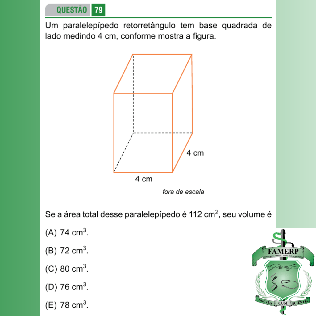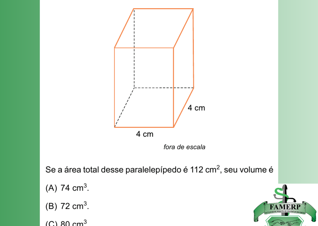 Se a área total desse paralelepípedo é 112 cm², seu volume é